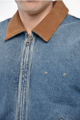 Padded Denim Jacket with Corduroy Collar and Embroidered Logo