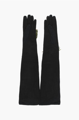 Leather Solid-Color Opera Gloves with Gold Detail