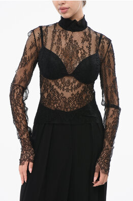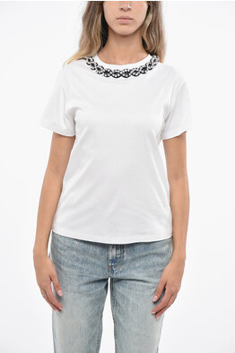 T-Shirt a Maniche Lunghe in Cotone con Applicazioni in Pizzo