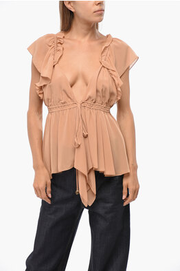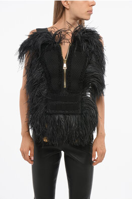 Top in Tinta Unita con Zip Dorata e Rifinitura in Piume Tono su Tono