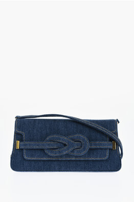 Denim Shoulder Bag with Vintage Effect Embroidery and Leather Details